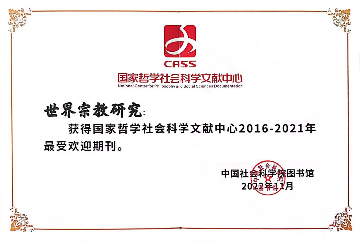 2023年1月,国家哲学社会科学文献中心发布《建设成果报告(2016-2022年)》和《中文期刊用户关注度报告(2021年度)》。《世界宗教研究》荣获“2016-2021最受欢迎期刊”和“2021年度宗教学最...